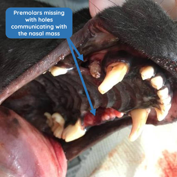 Figure 3 - Oral cavity. Both premolars absent, and associated oronasal fistula as a consequence of the nasal mass.