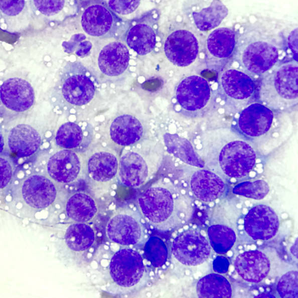 Cellular features. They have abundant, pale blue cytoplasmic containing prominent, cytoplasmic 'punctate' vacuoles. Nuclei are round with coarse chromatic and often a large, single nucleolus. Anisocytosis (variation in cell size) and anisokaryosis (variation in nuclear size) are, in general, mild to moderate, and mitotic figures are often common.