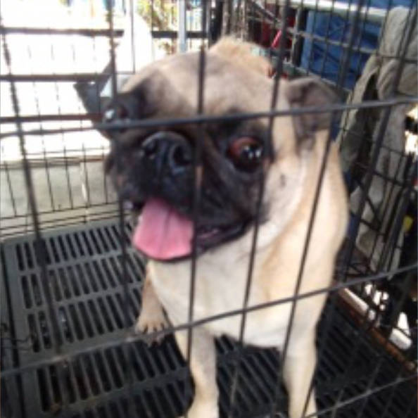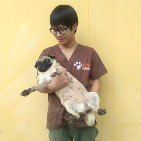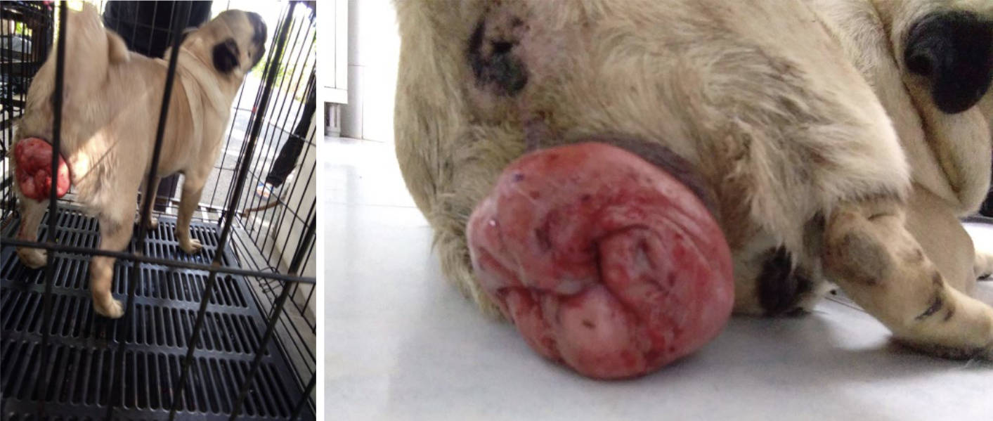 Leah, a female pug, was found at a local temple near Chiang Mai, Thailand (suspected to have been disowned). A local lady, who regularly feeds the temple dogs, noticed that something was "hanging out" of her vulva, and so she brought her to our 'WVS Thailand Rescue Centre' for treatment.