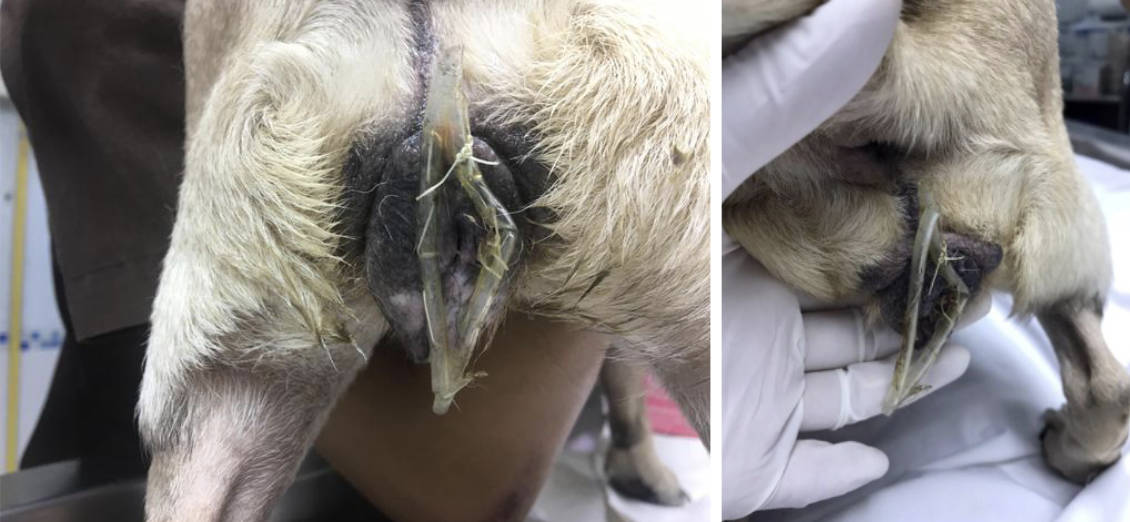 Vaginal prolapse is an uncommon condition in the bitch. The aetiology is linked to increased oestrogen hormone stimulation on the vaginal mucosa during proestrus, oestrus and near parturition, and so vaginal prolapse almost always occurs in entire female dogs. Oestrogen stimulation normally causes vaginal mucosa to become oedematous, keratinsed and hyperaemic. Other causes include genetic predisposition, dystocia, chronic constipation (excessive straining) and interruption of the mating process. For Leah, we suspected that she was kept on a breeding farm, which likely put a considerable stress on her reproductive system. In addition, brachycephalic breeds have high incidence of this condition due to hereditary weakness of the peri-vulvar tissue.