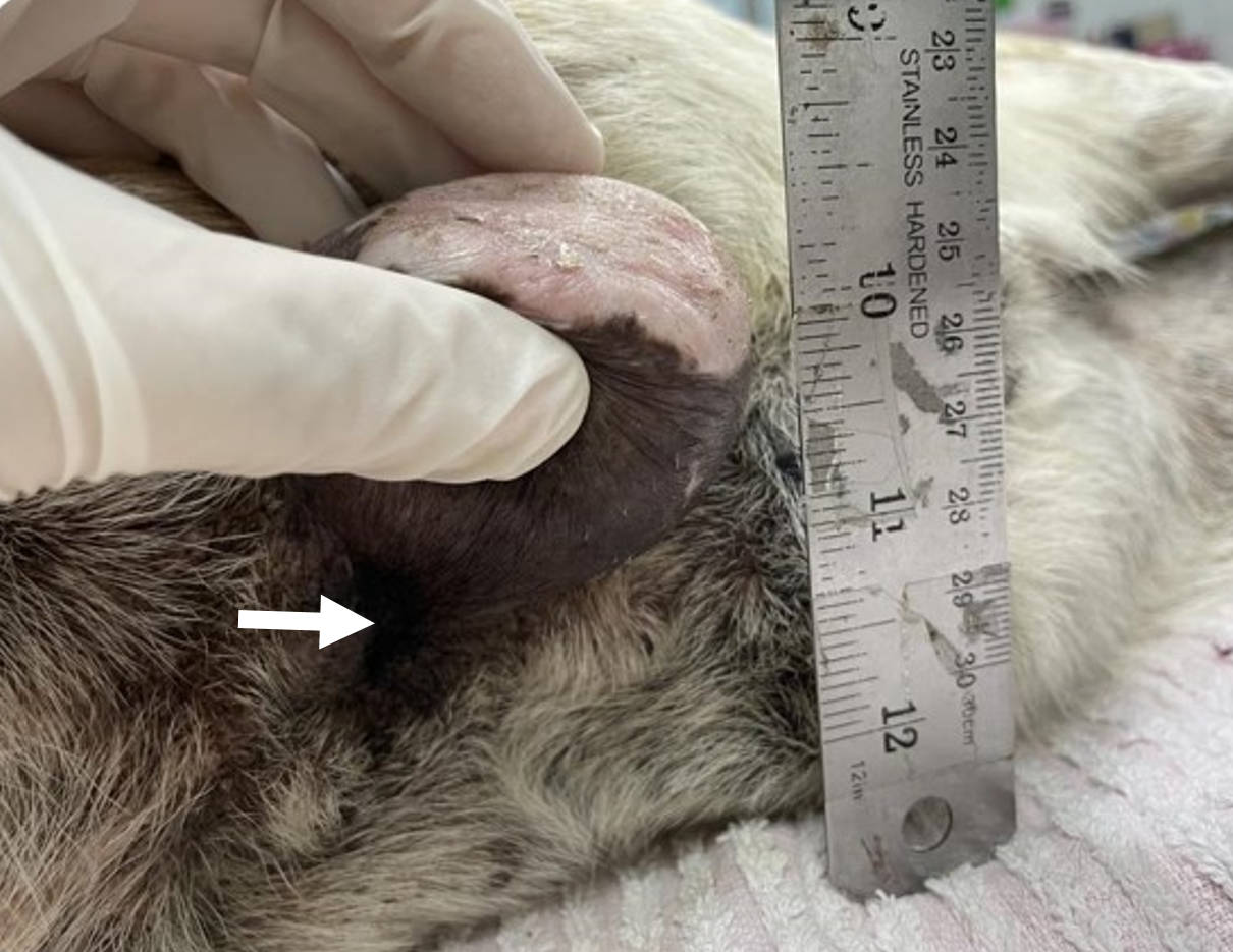 Figure 3 - Ocean's perianal mass prior to surgery. Note the small stalk like attachment to the underlying skin layer (arrow).