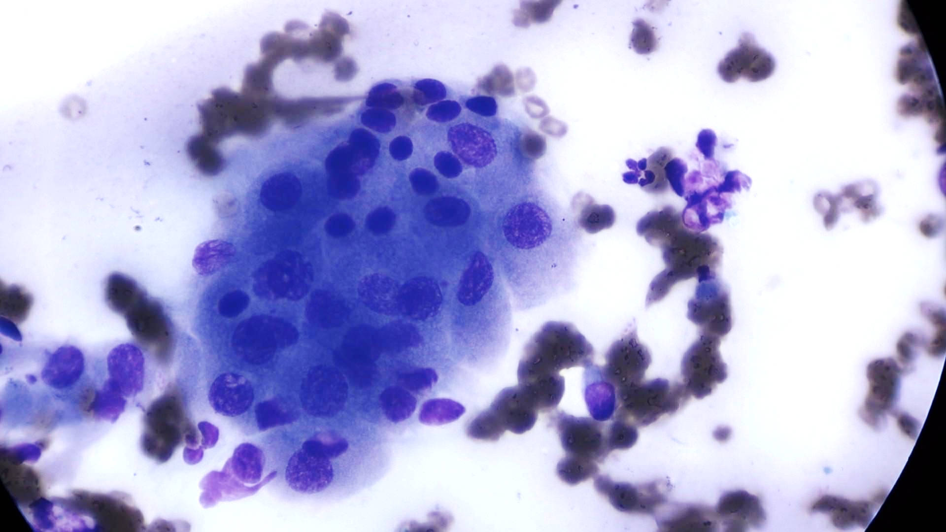 Some of the cells in Ocean's sample were pleomorphic, suggestive of a low-grade adenocarcinoma. It should be remembered, however, that it is difficult to distinguish an adenoma from an adenocarcinoma on cytology alone, and histopathological examination is always recommended, where possible.