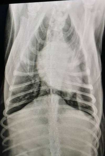 Due to the slight concern of the presence of an adenocarcinoma, a thoracic radiograph was taken to investigate presence of lung metastases. Radiographic findings revealed an interstitial lung pattern.