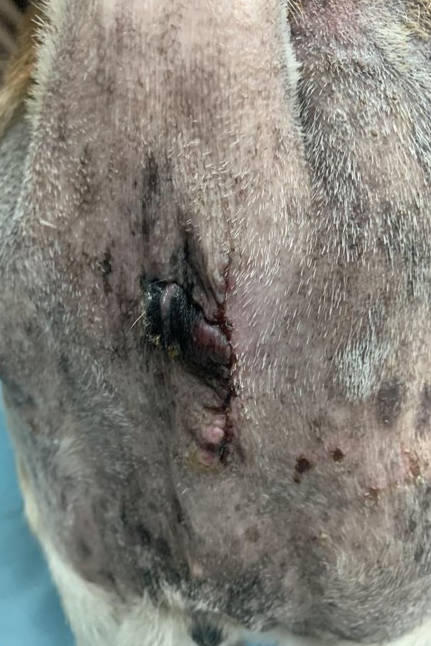 Due to the close proximity of the surgical wound to the anus, amoxicillin/clavulanate antibiotic tablets were prescribed for 7 days as well as a NSAID (Carprofen) for 5 days after surgery. The wound was assessed frequently to ensure uncomplicated healing.